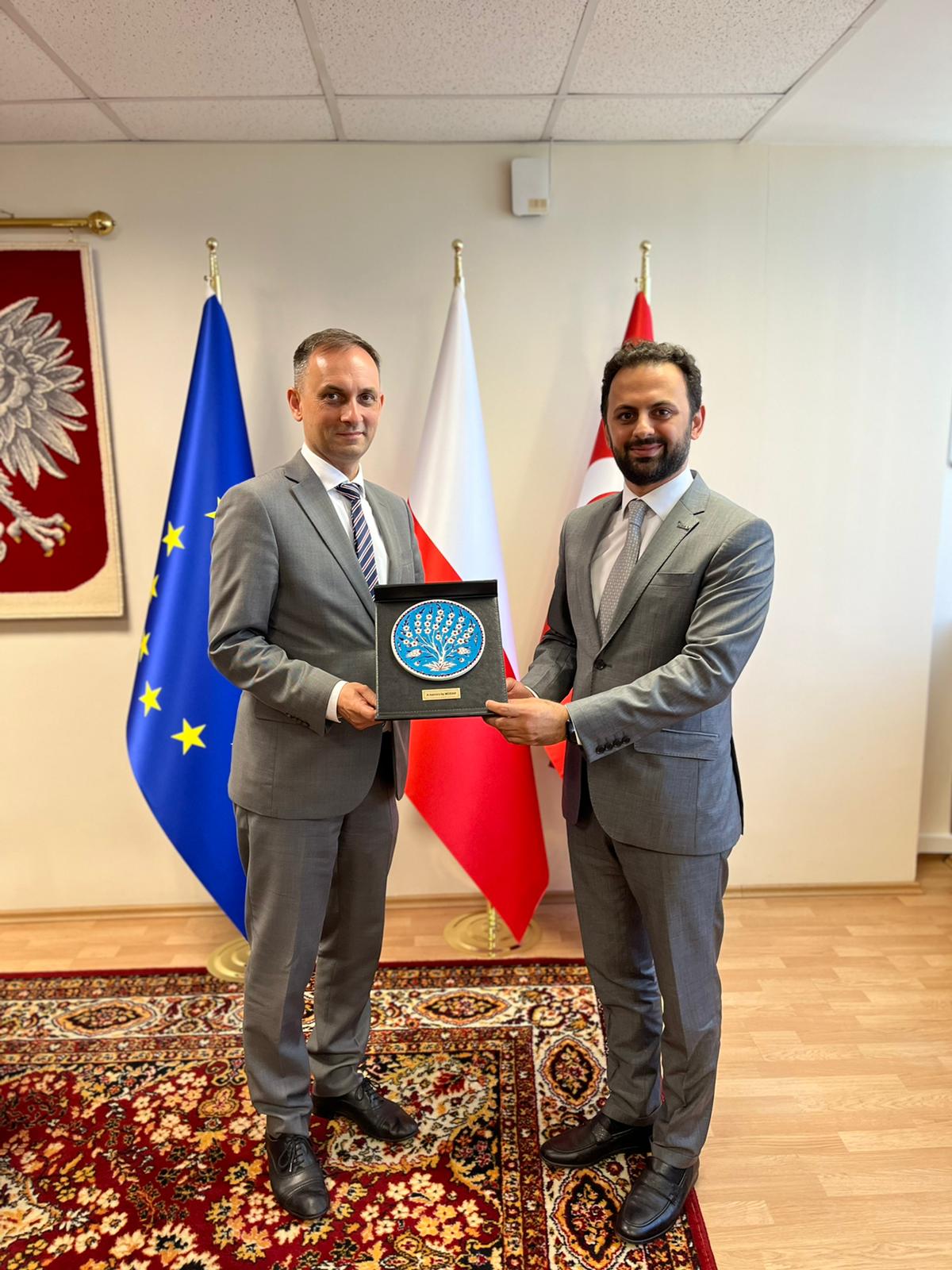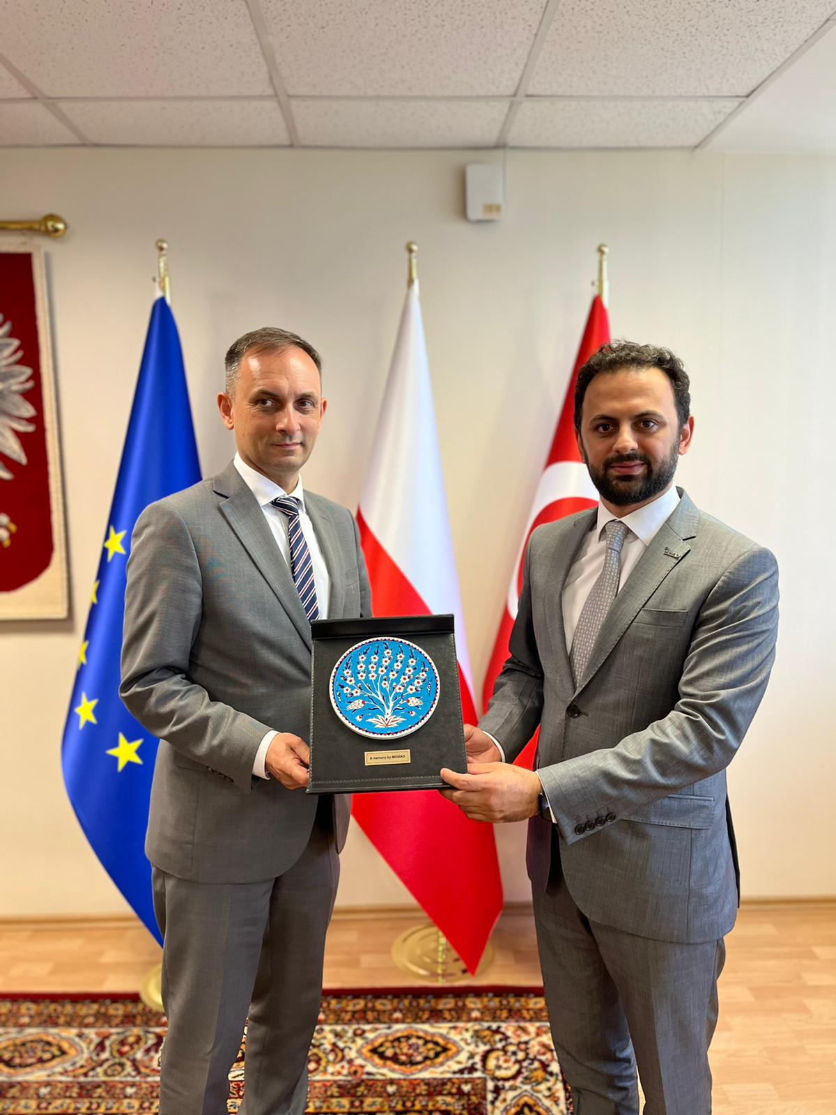 Diplomatik İlişkiler Komisyonu Başkanı Osman Nuri Önügören ve Komisyon Üyesi Muhammed Şerif Ökmen, Polonya İstanbul Başkonsolosu Witold Maciej Lesniak ve Dış İlişkilerden Sorumlu Ticaret Müşaviri ile bir araya geldi. Görüşmede Polonya’da iş ve yatırım fırsatları ile teşvikler, Polonya’nın lojistik merkez olarak Avrupa’da nasıl kullanılabileceği, inşaat, altyapı, otomotiv, kimya, sanayi yapı makineleri sektörleri ile akıllı şehir projeleri ve yenilenebilir enerji alanlarında ortak gerçekleştirilebilecek projeler ele alındı. Ayrıca, MÜSİAD EXPO’22 tanıtımı yapılarak Polonya’daki ilgili kurumlara davetiye gönderilmesi için destekler görüşüldü.