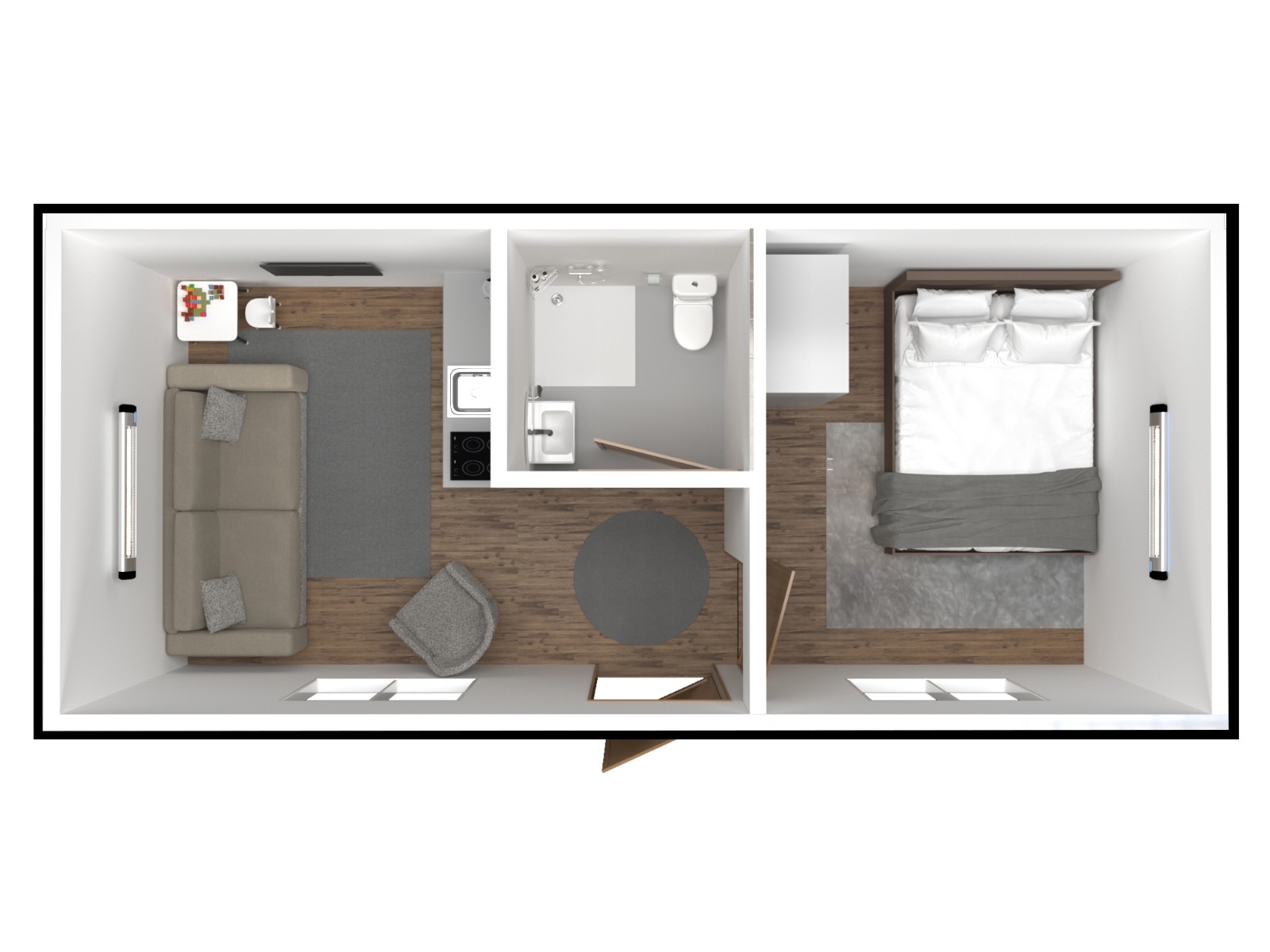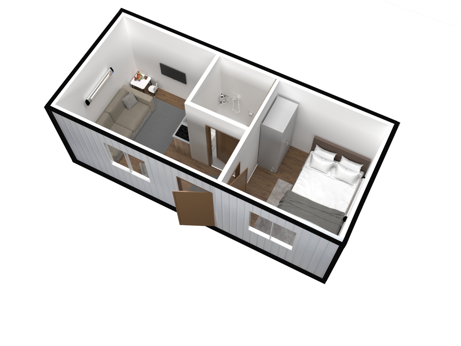 Konteynerlar 2 yetişkin ve 2 çocuk yaşayabilecek şekilde tasarlanmıştır.