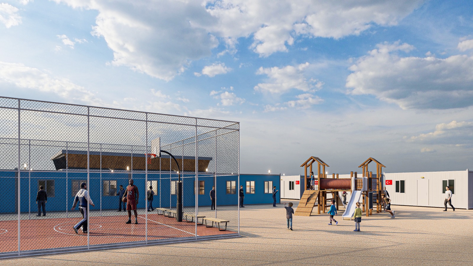 Kent içerisine çocuk oyun alanları, parklar, basketbol ve futbol sahaları, kreş, mescit, çamaşır alanı ve ihtiyaç duyulacak diğer sosyal alanlar yapılacaktır. Yani yaşayan vatandaşlarımızın ihtiyaç duyacağı bütün sosyal olanaklar kent içerisinde oluşturulacaktır. Konteyner kentimiz Elbistan’ın merkezinde bulunacağı için Elbistan içerisinde eğitime uygun okullarda çocuklarımız okullarına devam edebileceklerdir.