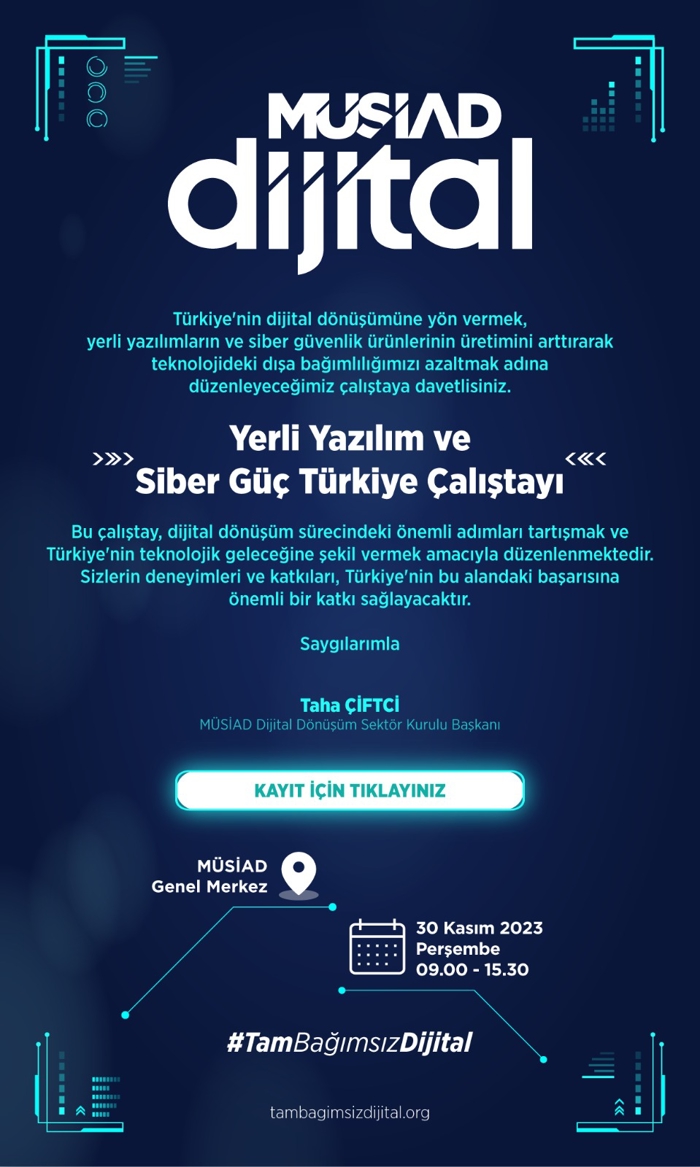 Çalıştay hakkında konuşan MÜSİAD Dijital Dönüşüm Sektör Kurulu Başkanı Taha Çiftci amaçlarını şöyle anlattı: “Bu çalıştay, dijital dönüşüm sürecindeki önemli adımları tartışmak ve Türkiye'nin teknolojik geleceğine şekil vermek amacıyla düzenlenmektedir. Türkiye'nin dijital dönüşümüne yön vermek, yerli yazılımların ve siber güvenlik ürünlerinin üretimini arttırarak teknolojideki dışa bağımlılığı azaltmak adına düzenlediğimiz çalıştaya sektörün tüm paydaşlarını bekliyoruz.”