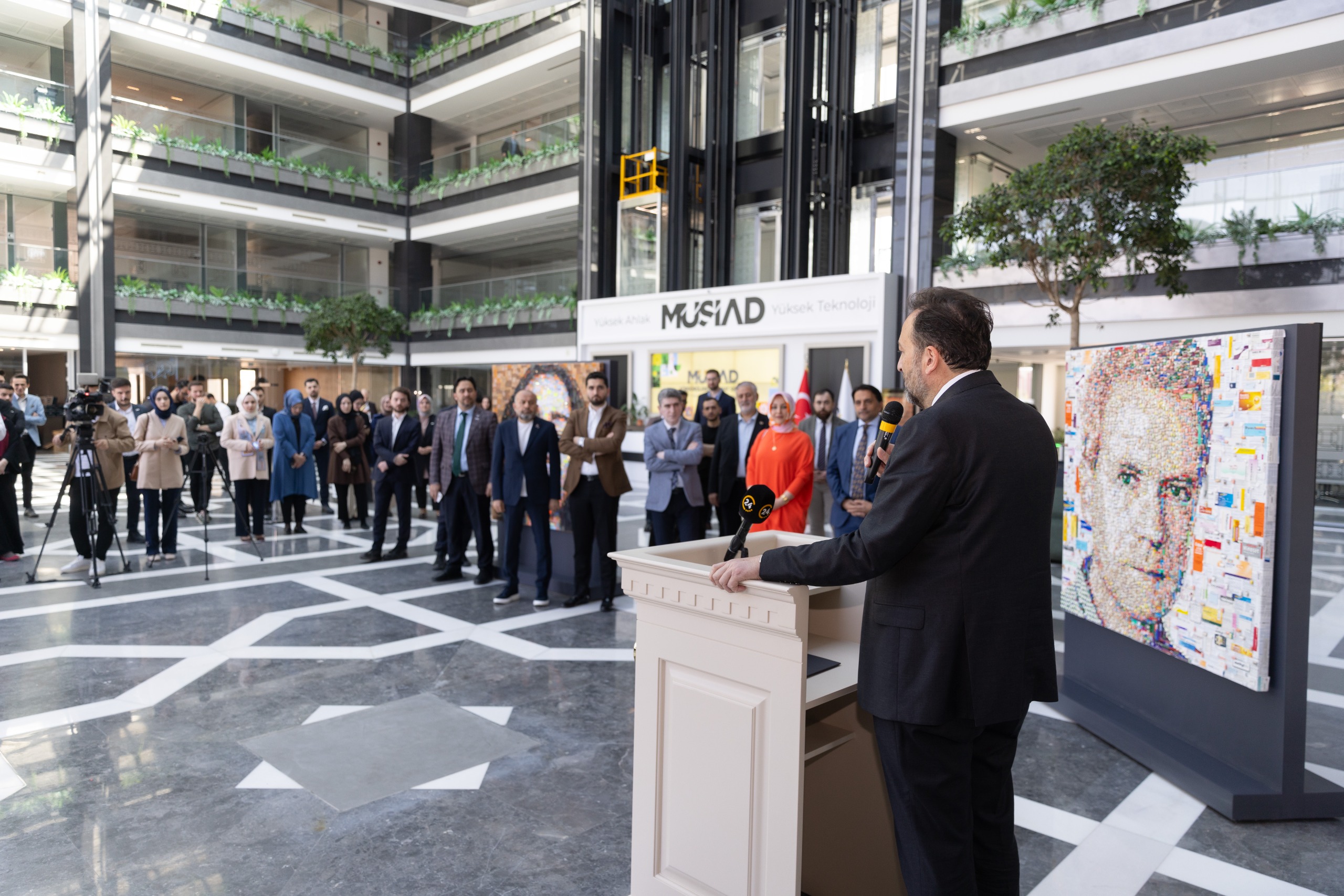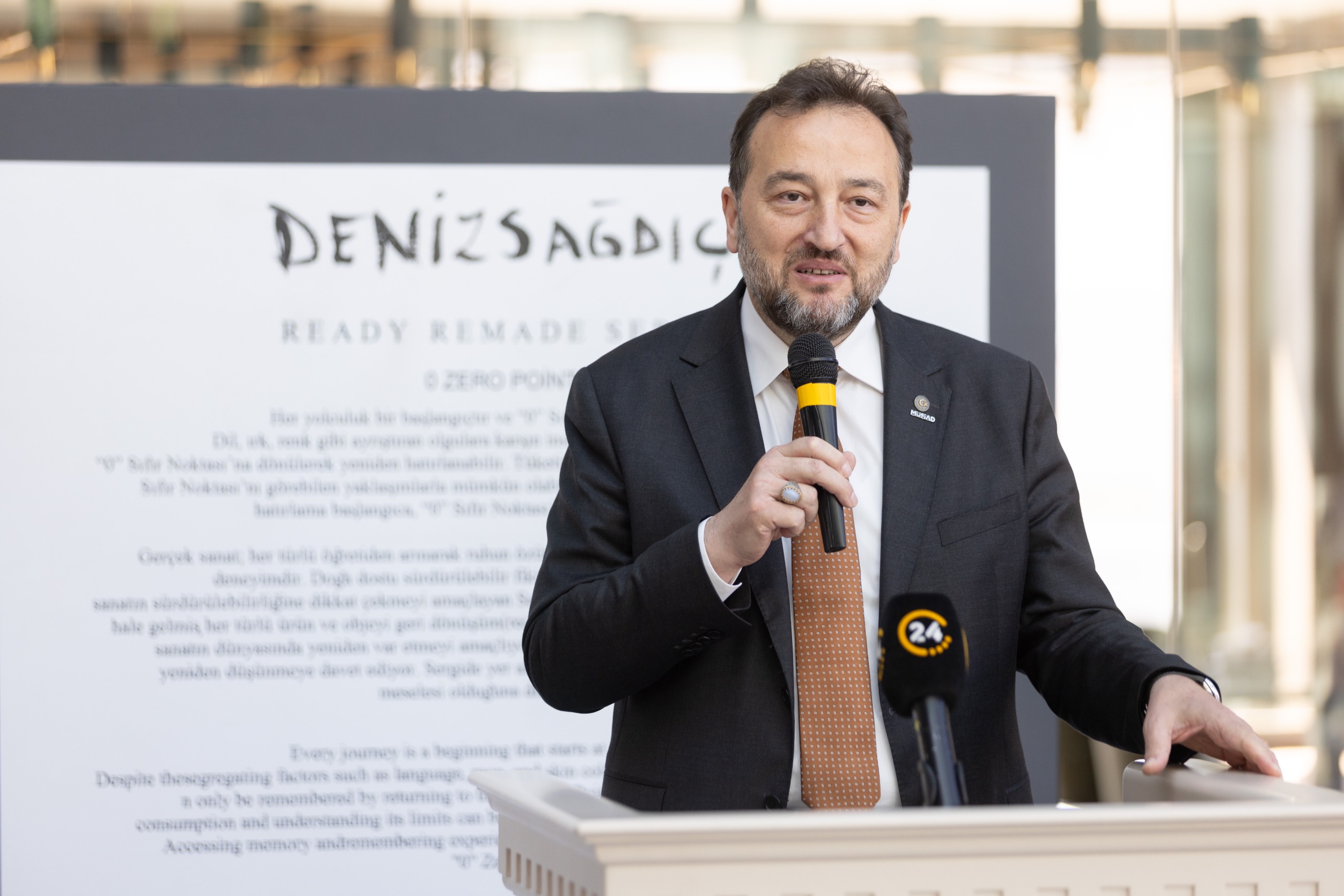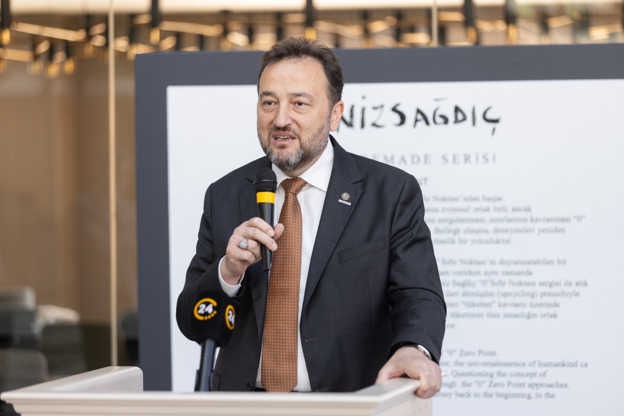 Etkinlikte konuşan MÜSİAD Genel Başkanı Mahmut Asmalı, “MÜSİAD’ın 34. yıl kapsamında düzenlediğimiz bu etkinlikte çok değerli sanatçımız Deniz Sağdıç’ın eserlerini sanatseverlerle buluşturmaktan memnuniyet duyuyoruz. Biz MÜSİAD olarak, sürdürülebilirliğin işletmeler ve dünyadaki kaynakların etkin kullanımı için en önemli konulardan biri olduğunu sık sık vurgulamaktayız. MÜSİAD olarak sorumluluğumuzu yerine getirmek, farkındalık oluşturmak ve insanlara bu farkındalık ile sanat bilinci aşılamak, estetik algılarını geliştirmek amacıyla bu anlamlı sergiye aracılık etmekteyiz” dedi.