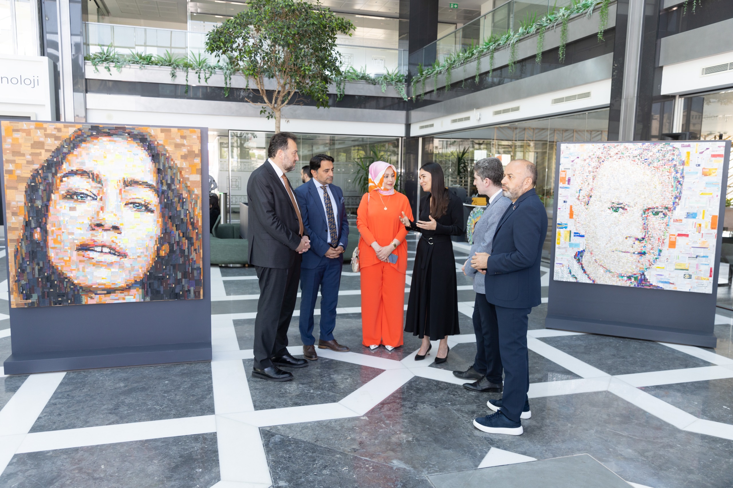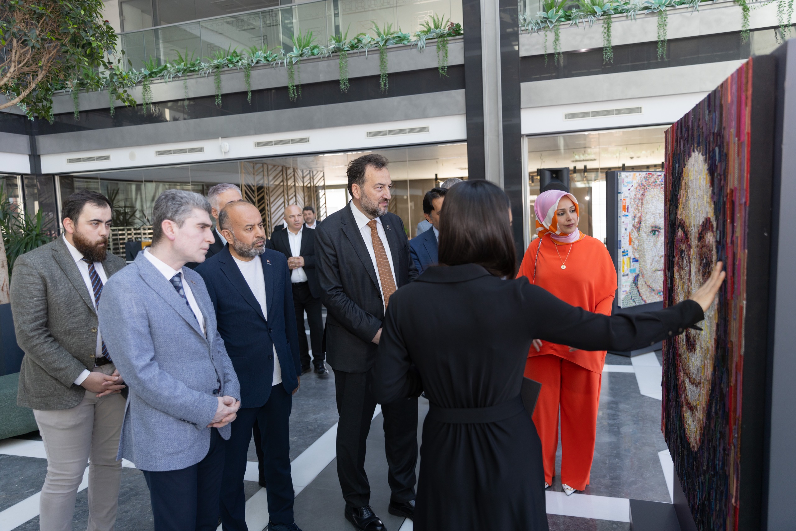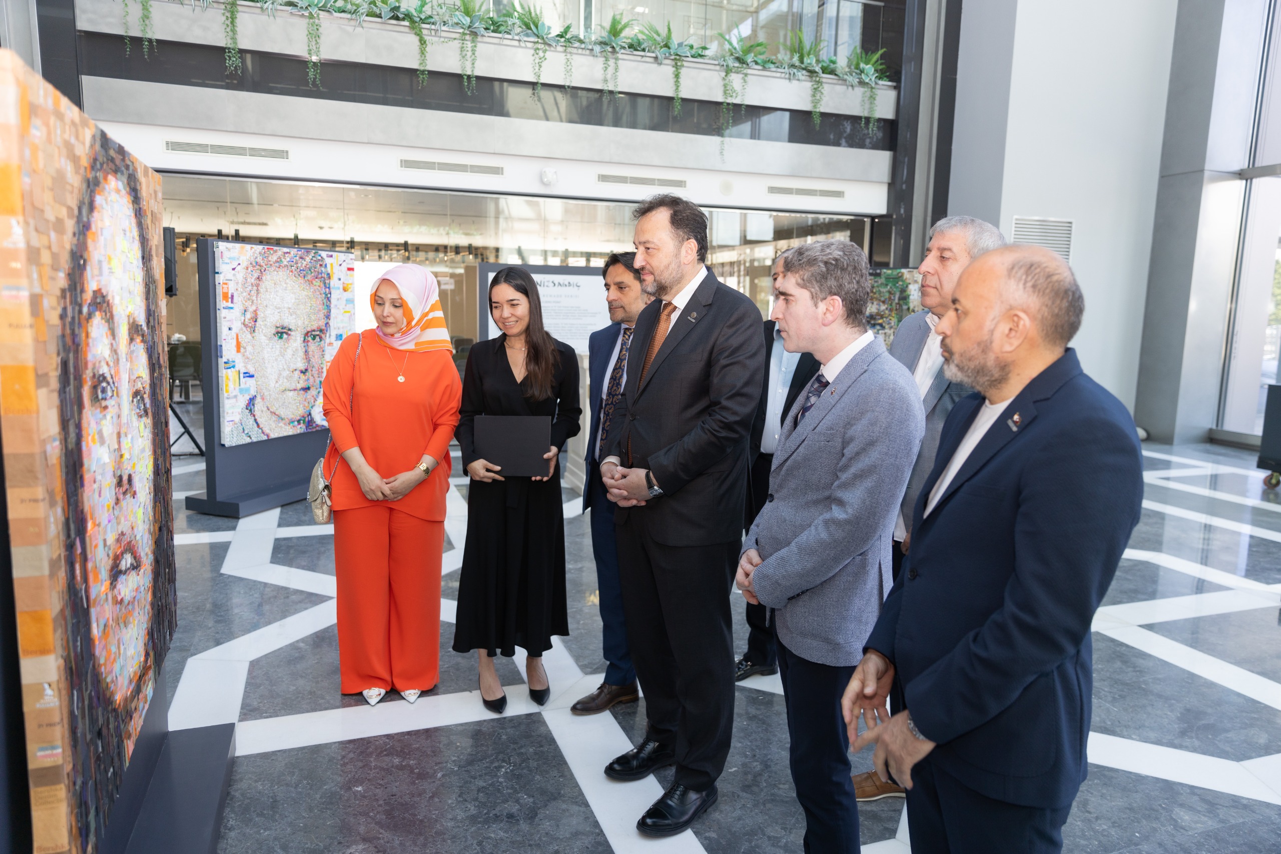 Deniz Sağdıç’ın toplanan atık malzemeleri, plastik kutuları, çöp poşetleri gibi kullanılmış ve atık hale gelmiş her türlü malzemeyi, objeyi, eşya parçalarını kullanarak sanat eserine dönüştürdüğü tablolar MÜSİAD Genel Merkezinde sergilendi.